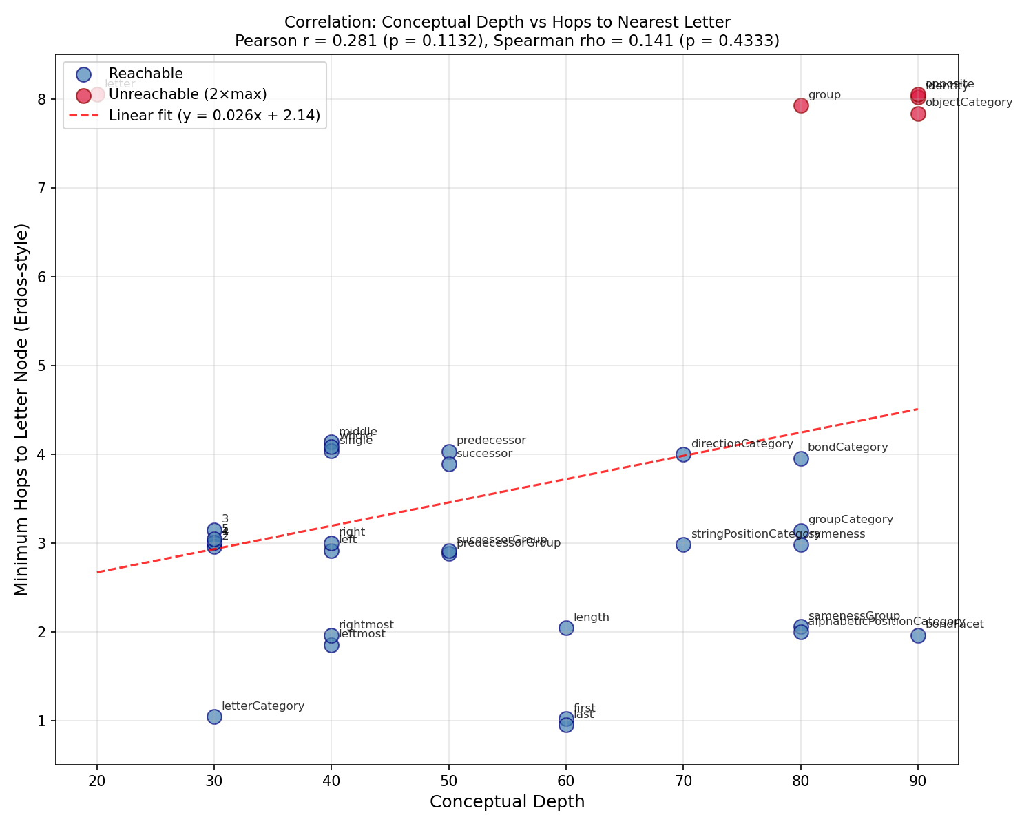and hop distance to letter nodes (r=0.281, p=0.113). Includes