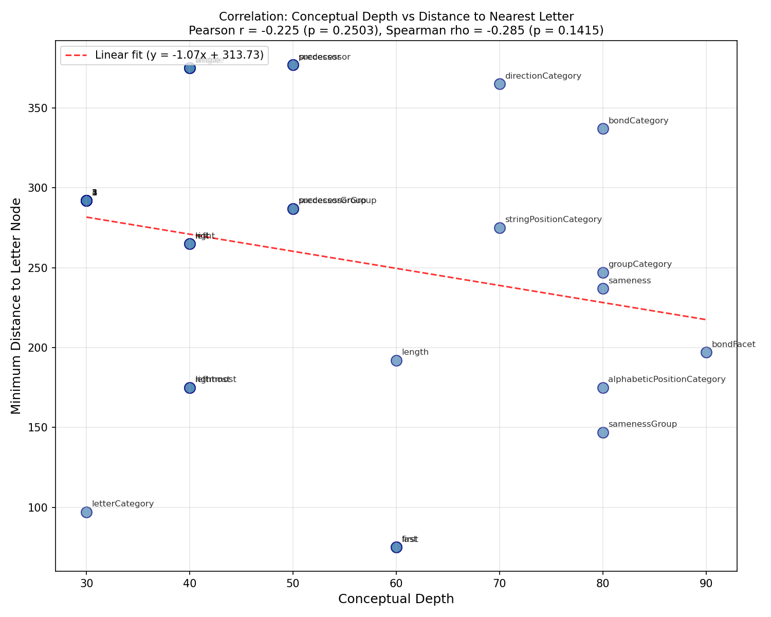 Analysis shows no significant correlation between conceptual depth and hop distance to letter nodes (r=0.281, p=0.113). Includes Python scripts, visualizations, and LaTeX paper. Co-Authored-By: Claude Opus 4.5 <noreply@anthropic.com>